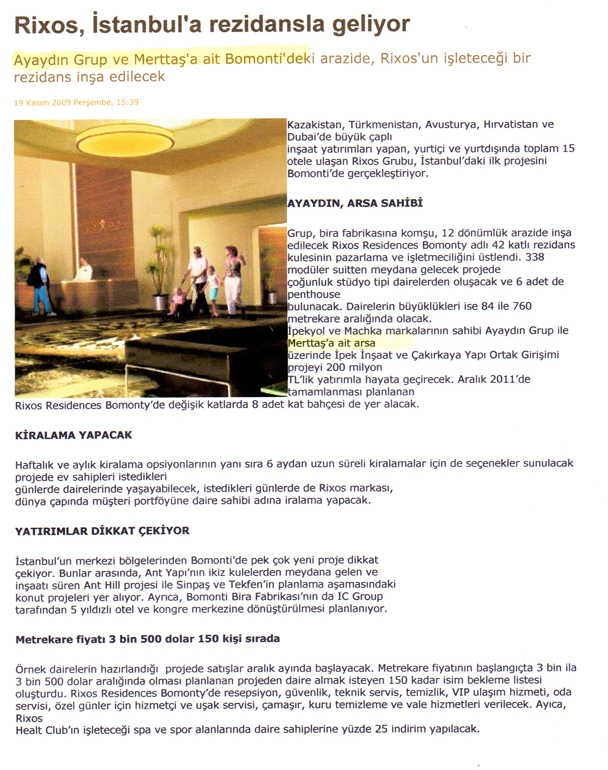 Bomonti' ye Rixos Residences geliyor 19 Kasım 2009 / Milliyet